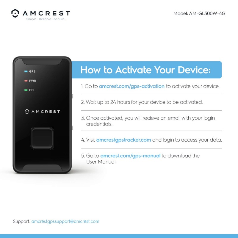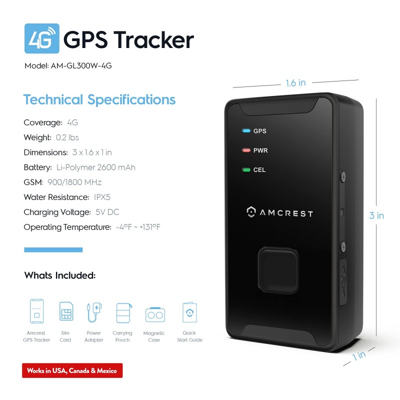 MODEL: AM-GL300W-4G Monthly GPS Subscription Plans : $19.99 for 60-sec updates $24.99 for 30-sec updates $29.99 for 15-sec updates $34.99 for 5-sec updates 4G GPS FEATURES : Desktop web-access (Chrome, Safari, Edge, Firefox) or through the GPS smartphone app (iOS/Android). The user interface allows you to easily monitor activity, manage alerts and generate custom reports. Create links and share them with your friends, family and co-workers to keep track of cars, children, seniors and assets. GSM: 900/1800 Mhz. Receive text, push and email notifications directly to your smartphone or PC with the GPS app and desktop web-access client. Intelligent Battery Alerts notify you when the battery is low. Reports whether the GPS Device is Powered On & Off. SOS Alarm feature used by pressing the Function button. IPX5 Weather Resistant. Comes with extended 2600mah battery which lasts up to 10-14+ days on a full charge with 60sec updates (7-8 days with 30sec updates, 4-5 days with 15sec updates, and 2-3 days with 5sec updates). Utilizes Google Maps for tracking and mapping.GPS Tracker is limited to 4G and will only work in areas where there is 4G coverage.Charging Voltage: 5V DC. Operating Temperature: -4°F ~ +131°F (-20°C ~ +55°C). GPS Dimensions: 3 x 1.5 x 1 inches.GPS Weight: 0.22 lbs. PACKAGE INCLUDES : 1 x 4G GPS Tracker with Pre-installed SIM Card (AM-GL300W-4G) 1 x Mini USB 5V AC Power Adapter 1 x IP65 Weatherproof Magnetic Case1 x GPS PouchQuick Start Guide IMPORTANT - This device is configured to work in the US, Canada and Mexico only. This device Does Not Work in Australia. We stand by our products and offer unlimited support. In the event that your device produces undesirable results, we'll gladly refund 100% of your hardware and subscription charges. |